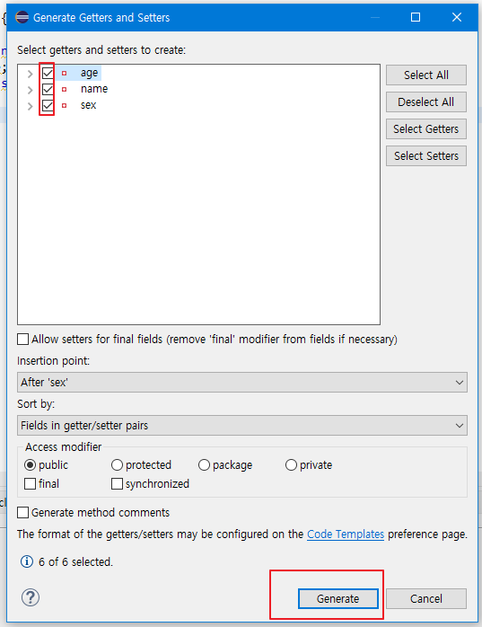 getter setter 를 만들고 싶은 변수에 체크를 하고
