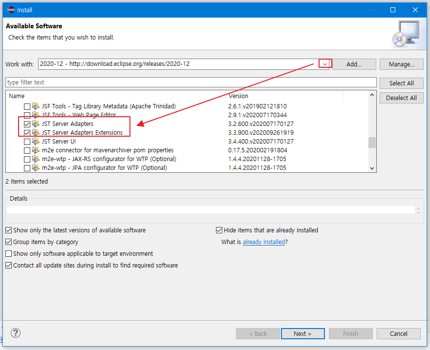 JST server adapters , JST server adapters extensions 를 두개 클릭 후 설치한다.