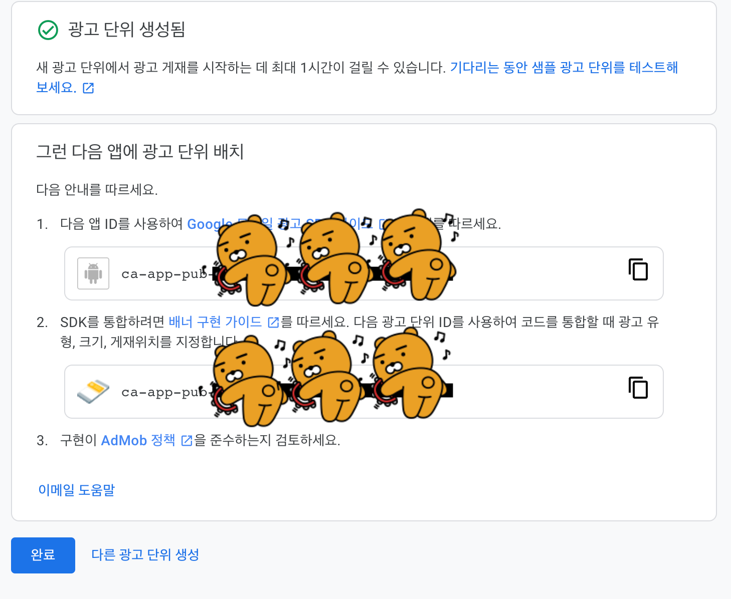 완료를 하면 광고단위에 방금 추가한 하단 배너가 뜬다.