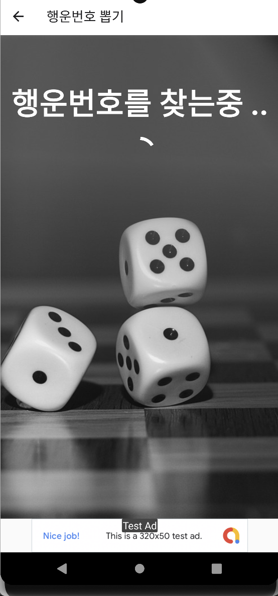 행운번호 뽑기 버튼을 터치하면 행운번호를 뽑는 화면으로 이동되며 로또번호 6개가 뽑히게 된다.