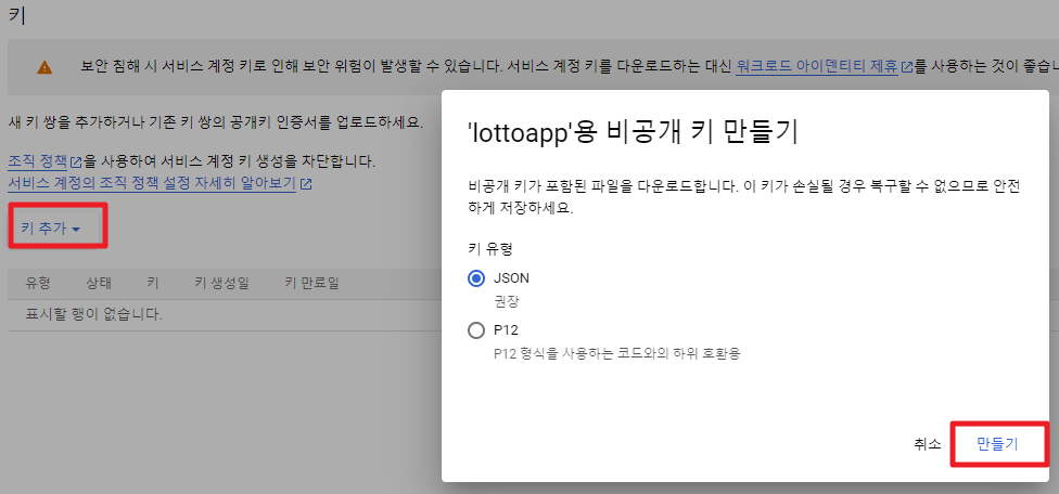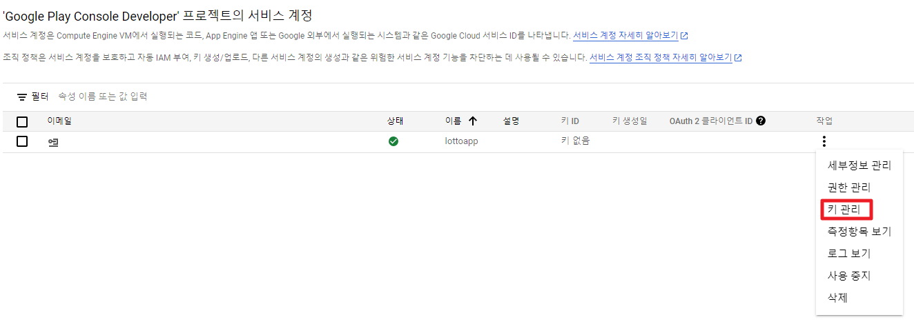 생성된 서비스 계정에 키관리를 선택 해준다.