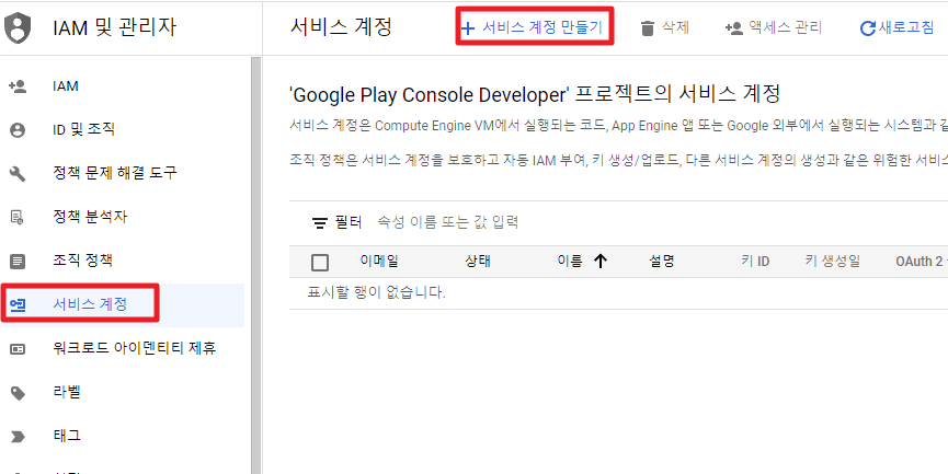 서비스 계정 에서 서비스 계정만들기를 해준다.