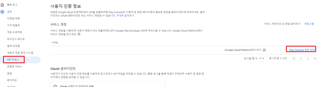 먼저 구글 콘솔에서 설정 > API 엑세스 해준다.