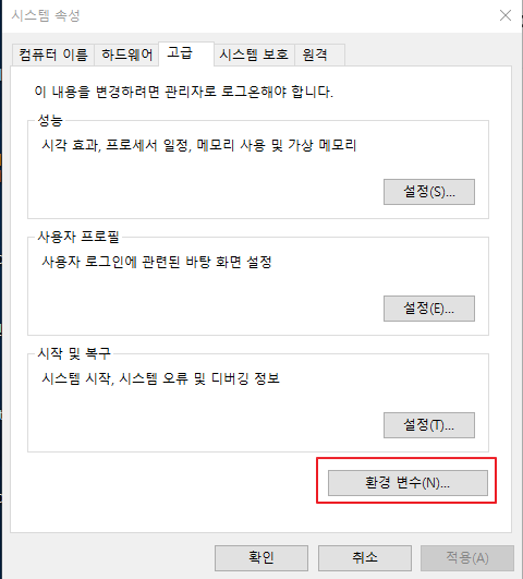 고급 시스템 설정 > 시스템 속성 > 환경변수