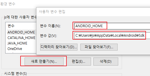 시스템 변수가 아닌 그냥 변수에 ANDROID_HOME 으로 sdk 경로를 새로 추가해주니